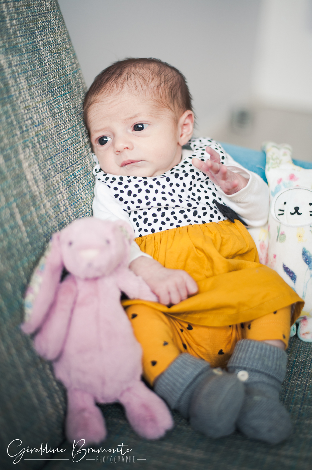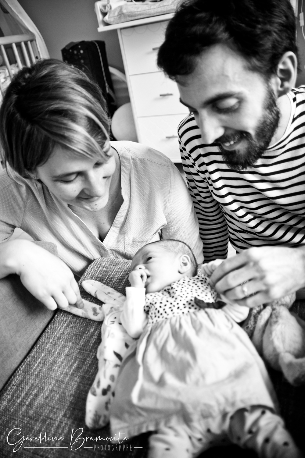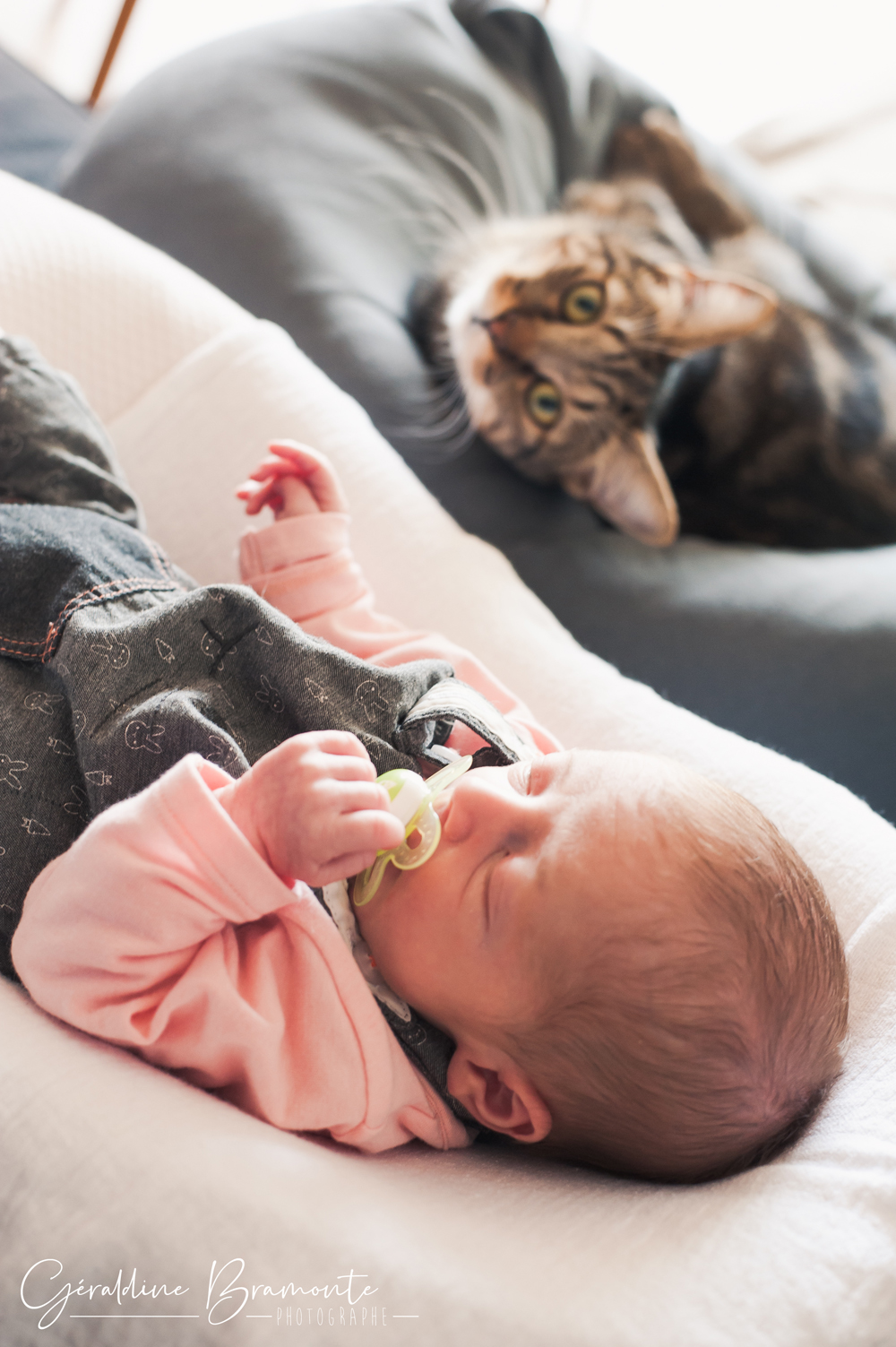 Voici les photos de la séance photo naissance de Juliette. Dans la chambre de la toute jeune Juliette, à peine 3 semaines avec ses parents Pauline & Davy, dans leur appartement de Lyon. Même le chat s’était invité à la séance 😉